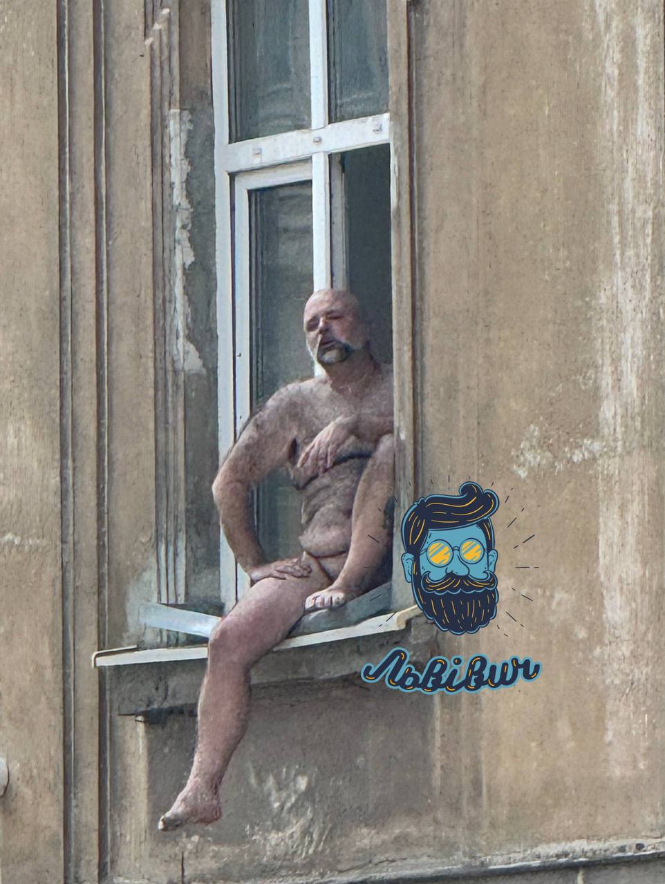 Во Львове голыйамериканец вылез на подоконник, кричит на людей иперманентно зигует. Следующим этапом будет уход в схрон и вызов духа Бандеры.